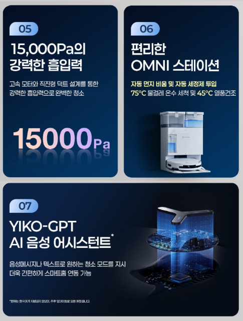 - 7,000Pa 흡입력과 물걸레 자동세척·건조 지원
